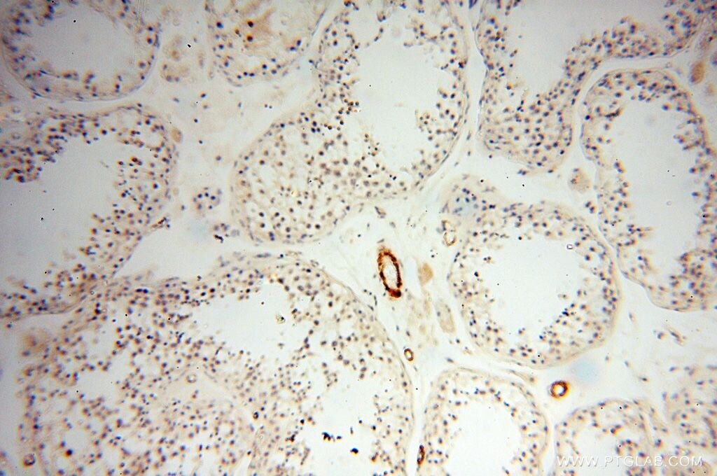 - Immunohistochemistry of paraffin-embedded human testis using 17564-1-AP (CD146/MCAM antibody) at dilution of 1:100 (under 40x lens).