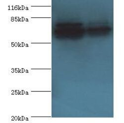 - Western blot. All lanes: ATP5A1 antibody at 2 ug/ml. Lane 1: HeLa whole cell lysate. Lane 2: COLO205 whole cell lysate. Secondary antibody: goat polyclonal to rabbit at 1:10000 dilution. Predicted band size: 60 kDa. Observed band size: 60 kDa. This image was taken for the unconjugated form of this product. Other forms have not been tested.