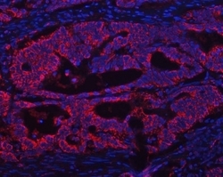 - Immunofluorescent staining of FFPE human colon cancer tissue with ATP5A1 antibody (red) and DAPI nuclear stain (blue). HIER: steam section in pH8 EDTA for 20 min.