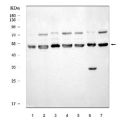 - Western blot testing of human 1) SK-OV-3, 2) MCF7, 3) HL60, 4) RT4, 5) Daudi, 6) ThP-1 and 7) HepG2 cell lysate with ATP5A1 antibody. Predicted molecular weight ~54-60 kDa (multiple isoforms).