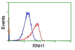 - HEK293T cells transfected with either RC208360 overexpress plasmid(Red) or empty vector control plasmid(Blue) were immunostained by anti-RNH1 antibody(TA501874), and then analyzed by flow cytometry.