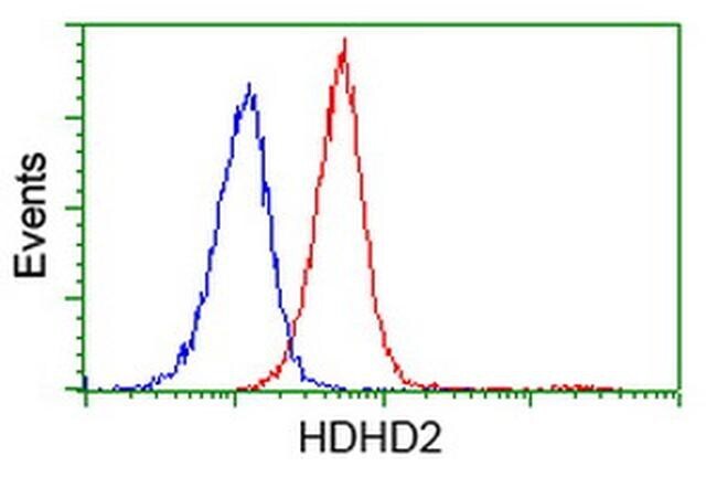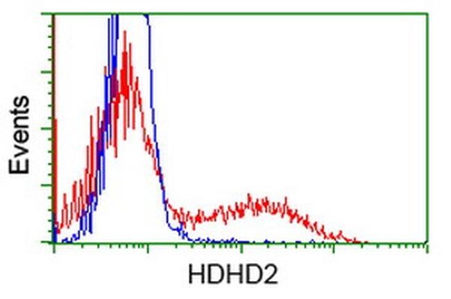 - HEK293T cells transfected with either RC205967 overexpress plasmid (Red) or empty vector control plasmid (Blue) were immunostained by anti-HDHD2 antibody (TA502834), and then analyzed by flow cytometry.