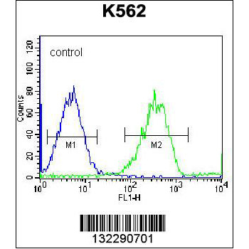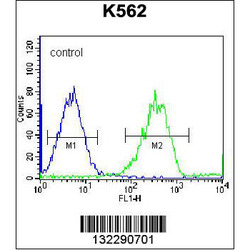 - F105A Antibody (Center) (Cat. #OAAB08905) flow cytometric analysis of K562 cells (right histogram) compared to a negative control cell (left histogram).FITC-conjugated goat-anti-rabbit secondary antibodies were used for the analysis.