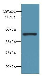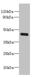 - Western blot All lanes: FAM105A antibody at 8µg/ml + K562 whole cell lysate Secondary Goat polyclonal to rabbit IgG at 1/10000 dilution Predicted band size: 43 kDa Observed band size: 43 kDa