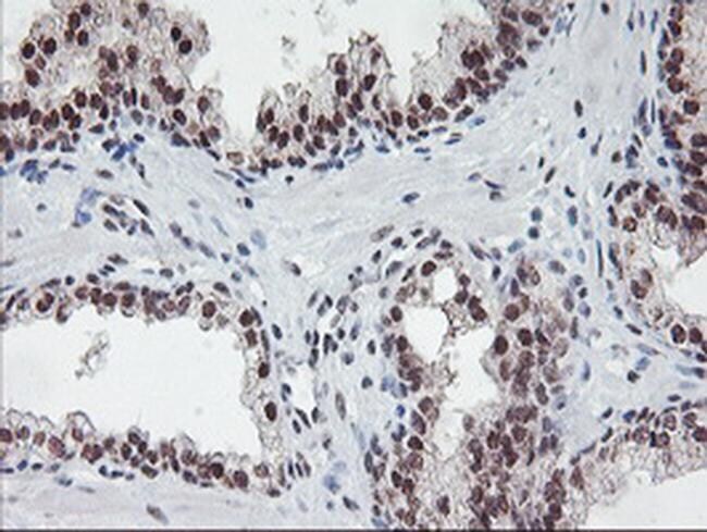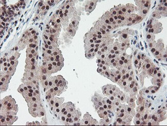 - Immunohistochemical staining of paraffin-embedded Carcinoma of Human prostate tissue using anti-POLR2E mouse monoclonal antibody. (Heat-induced epitope retrieval by 10mM citric buffer, pH6.0, 100°C for 10min, TA502548)