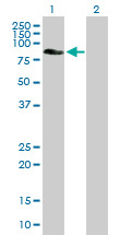 - Western Blot analysis of EPS8L2 expression in transfected 293T cell line (H00064787-T01) by EPS8L2 MaxPab polyclonal antibody.Lane 1: EPS8L2 transfected lysate(78.65 KDa).Lane 2: Non-transfected lysate.