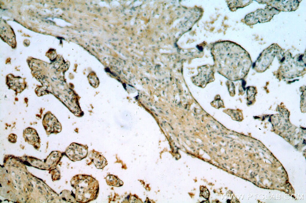 - Immunohistochemistry of paraffin-embedded human placenta using 20461-1-AP (EPS8L2 antibody) at dilution of 1:100 (under 10x lens).