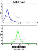 - Flow cytometric analysis of K562 cells using TALDO1 Antibody (Center)(bottom histogram) compared to a negative control cell (top histogram). FITC-conjugated goat-anti-rabbit secondary antibodies were used for the analysis.