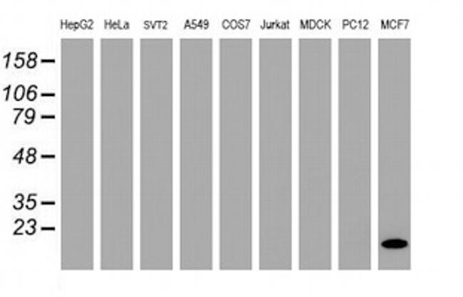 - Western blot analysis of extracts (35 µg) from 9 different cell lines by usin g anti-FXYD3 monoclonal antibody (HepG2: human; HeLa: human; SVT2: mouse; A549: human; COS7: monkey; Jurkat: human; MDCK: canine; PC12: rat; MCF7: human).