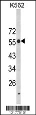 - Western blot analysis of LAG3 Antibody (Center) in K562 cell lysates (35ug/lane). LAG3 (arrow) was detected using the purified Pab.