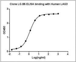 - ELISA binding of Human LAG3 Antibody (LG.B5) with Recombinant human LAG3-Fc (R&D, 2319-L3), Coating antigen: Recombinant human LAG3-Fc, 0.5 µg/ml, LAG3 antibody dilution start from 1000 ng/ml, EC50= 1.203 ng/ml.