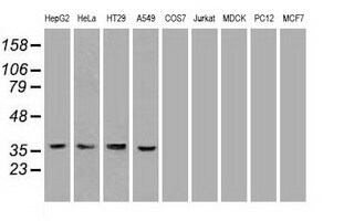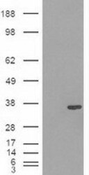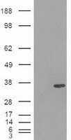 - HEK293T cells were transfected with the pCMV6-ENTRY control (Left lane) or pCMV6-ENTRY PDX1 (RC222354, Right lane) cDNA for 48 hrs and lysed. Equivalent amounts of cell lysates (5 µg per lane) were separated by SDS-PAGE and immunoblotted with anti-PDX1. Positive lysates LY400074 (100 µg) and LC400074 (20 µg) can be purchased separately from OriGene.