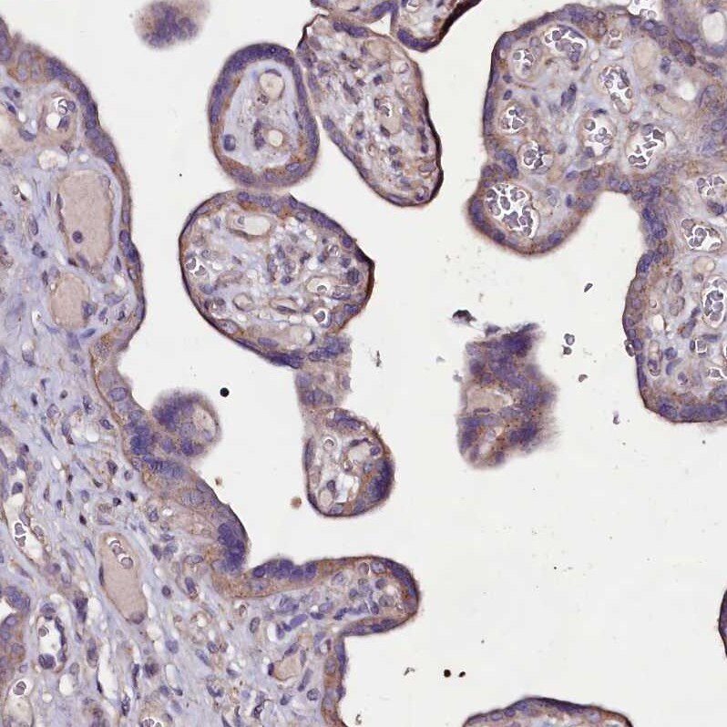 - Immunohistochemical analysis of USPL1 in human placenta using USPL1 Polyclonal Antibody (Product # PA5-58745) shows moderate cytoplasmic positivity in trophoblastic cells.