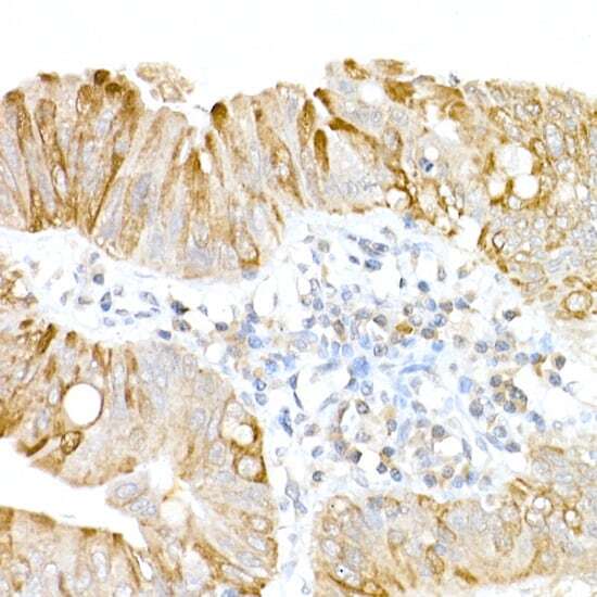 - Immunohistochemistry analysis of USP18 in paraffin-embedded human colon carcinoma. Samples were incubated with USP18 Polyclonal antibody (Product # PA5-110555) using a dilution of 1:20 (40x lens). Perform high pressure antigen retrieval with 10 mM citrate buffer pH 6.0 before commencing with IHC staining protocol.