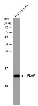 - Western blot analysis of FLAP in rat tissue extract using 50 µg of protein. Samples were separated with 15% SDS-PAGE and incubated with FLAP polyclonal antibody (Product # PA5-78368) using a dilution of 1:500.