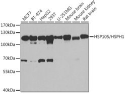 - Western blot analysis of extracts of various cell lines, using HSP105/HSP105/HSPH1 antibody (STJ28705) at 1:1000 dilution. Secondary antibody: HRP Goat Anti-rabbit IgG (H+L) at 1:10000 dilution. Lysates/proteins: 25ug per lane. Blocking buffer: 3% nonfat dry milk in TBST. Detection: ECL Basic Kit. Exposure time: 1s.