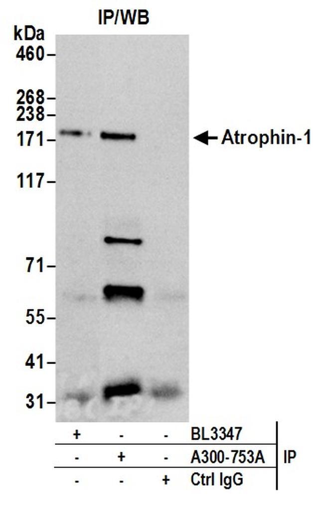 - Detection of human Atrophin 1 by western blot of immunoprecipitates. Samples: Whole cell lysate (1.0 mg per IP reaction; 20% of IP loaded) from HeLa cells prepared using NETN lysis buffer. Antibodies: Affinity purified rabbit anti-Atrophin 1 antibody A300-753A (lot A300-753A-2) used for IP at 3 µg per reaction. Atrophin 1 was also immunoprecipitated by rabbit anti-Atrophin 1 antibody BL3347. For blotting immunoprecipitated Atrophin 1, A300-753A was used at 1 µg/ml. Detection: Chemiluminescence with an exposure time of 3 minutes.