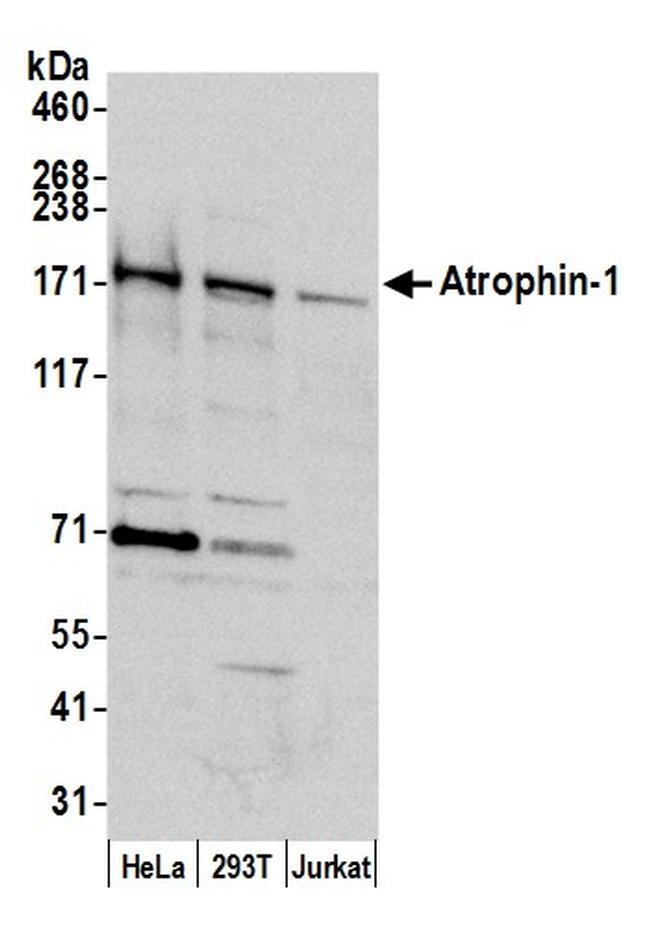 - Detection of human Atrophin 1 by western blot. Samples: Whole cell lysate (50 µg) from HeLa, 293T, and Jurkat cells prepared using NETN lysis buffer. Antibody: Affinity purified rabbit anti-Atrophin 1 antibody A300-753A (lot A300-753A-2) used for WB at 1 µg/ml. Detection: Chemiluminescence with an exposure time of 30 seconds.