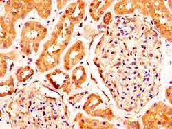 - Immunohistochemical analysis of RXFP2 in paraffin embedded human kidney tissue using a RXFP2 polyclonal antibody (Product # PA5-98625) at a dilution of 1:290. After dewaxing and hydration, antigen retrieval was mediated by high pressure in a citrate buffer (pH 6.0). Section was blocked with 10% normal goat serum 30min at RT. Then primary antibody (1% BSA) was incubated at 4°C overnight. The primary is detected by a biotinylated secondary antibody and visualized using an HRP conjugated SP system.