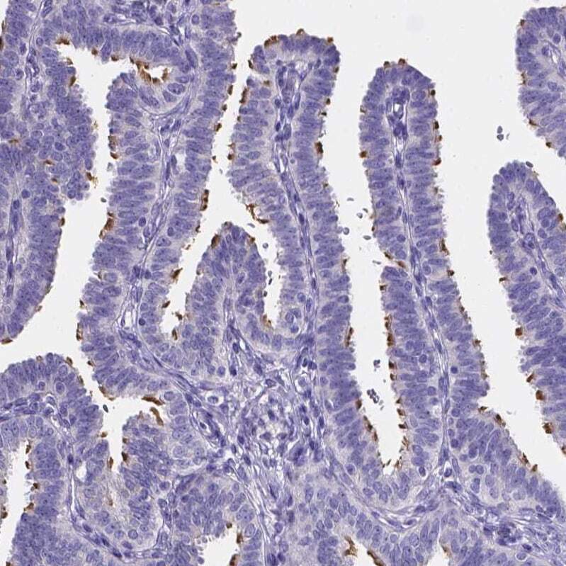 - Immunohistochemical analysis of SPEF2 in human fallopian tube using SPEF2 Polyclonal Antibody (Product # PA5-58854) shows strong cytoplasmic positivity in cilia in glandular cells.