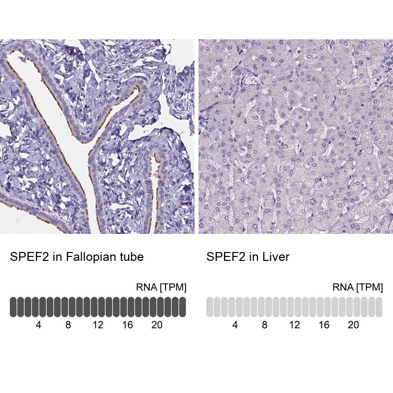 - Immunohistochemical staining of SPEF2 in human fallopian tube and liver tissues using SPEF2 Polyclonal Antibody (Product # PA5-58854). Corresponding SPEF2 RNA-seq data are presented for the same tissues.