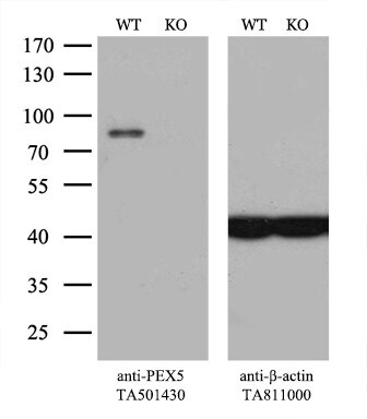 - Equivalent amounts of cell lysates (10 µg per lane) of wild-type 293T cells (WT, Cat# LC810293T) and PEX5-Knockout 293T cells (KO, Cat# LC812441) were separated by SDS-PAGE and immunoblotted with anti-PEX5 monoclonal antibody TA501430, (1:500). Then the blotted membrane was stripped and reprobed with anti-beta-actin antibody (TA811000) as a loading control.