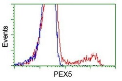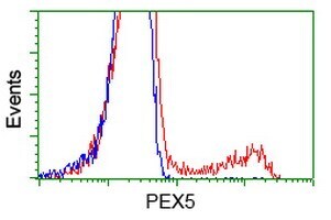 - HEK293T cells transfected with either RC202062 overexpress plasmid (Red) or empty vector control plasmid (Blue) were immunostained by anti-PEX5 antibody (TA501430), and then analyzed by flow cytometry.
