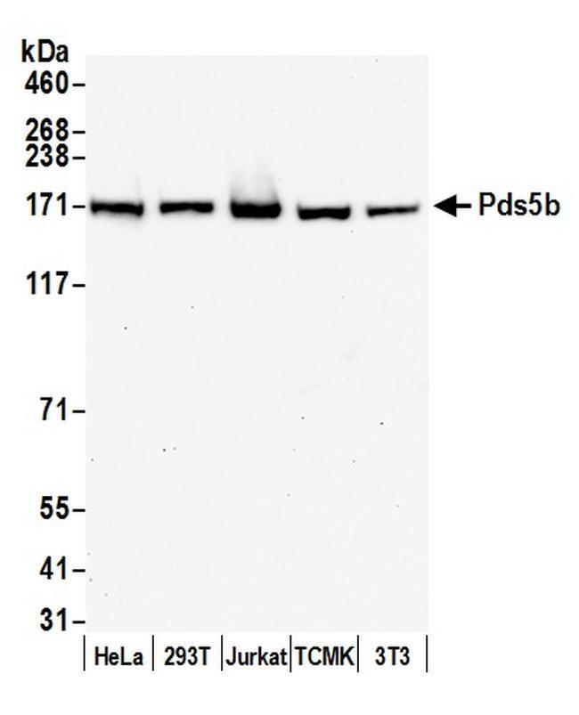- Detection of human and mouse Pds5b by western blot. Samples: Whole cell lysate (50 µg) from HeLa, 293T, Jurkat, mouse TCMK-1, and mouse NIH3T3 cells prepared using NETN lysis buffer. Antibody: Affinity purified rabbit anti-Pds5b antibody A300-538A (lot A300-538A-2) used for WB at 0.1 µg/ml. Detection: Chemiluminescence with an exposure time of 30 seconds.