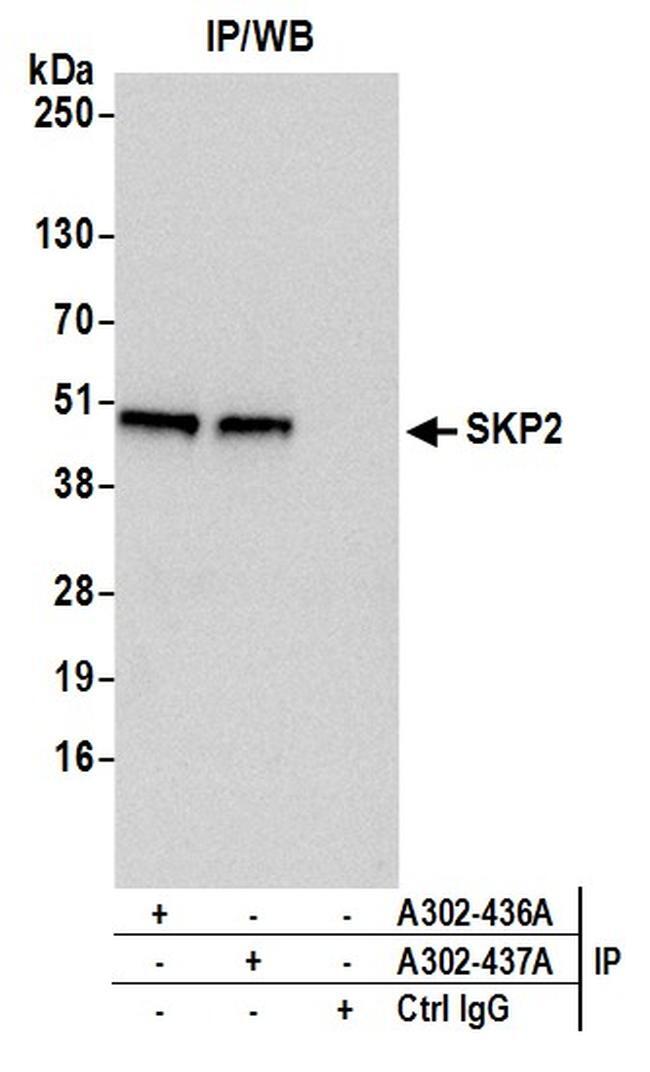 - Detection of human SKP2 by western blot of immunoprecipitates. Samples: Whole cell lysate (0.5 or 1.0 mg per IP reaction; 20% of IP loaded) from 293T cells prepared using NETN lysis buffer. Antibodies: Affinity purified rabbit anti-SKP2 antibody A302-436A (lot A302-436A-1) used for IP at 6 µg per reaction. SKP2 was also immunoprecipitated by rabbit anti-SKP2 antibody A302-437A. For blotting immunoprecipitated SKP2, A302-436A was used at 1 µg/ml. Detection: Chemiluminescence with an exposure time of 30 seconds.