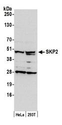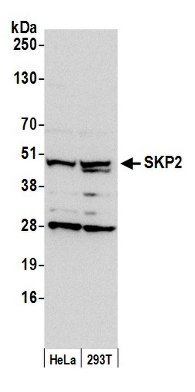 - Detection of human SKP2 by western blot. Samples: Whole cell lysate (50 µg) from HeLa and 293T cells prepared using NETN lysis buffer. Antibody: Affinity purified rabbit anti-SKP2 antibody A302-436A (lot A302-436A-1) used for WB at 0.1 µg/ml. Detection: Chemiluminescence with an exposure time of 30 seconds.