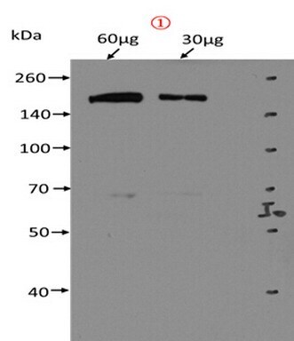 - HEK293T cells were transfected with the pCMV6-ENTRY control (Left lane) or pCMV6-ENTRY DOT1L (RC218547, Right lane) cDNA for 48 hrs and lysed. Equivalent amounts of cell lysates (5 µg per lane) were separated by SDS-PAGE and immunoblotted with anti-DOT1L. Positive lysates LY410109 (100 µg) and LC410109 (20 µg) can be purchased separately from OriGene.