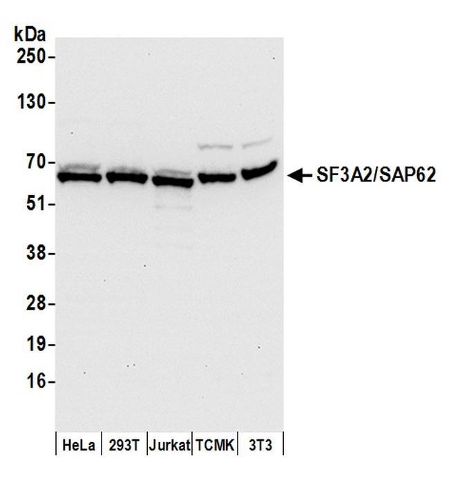 - Detection of human and mouse SF3A2/SAP62 by western blot. Samples: Whole cell lysate (50 µg) from HeLa, 293T, Jurkat, mouse TCMK-1, and mouse NIH3T3 cells prepared using NETN lysis buffer. Antibody: Affinity purified rabbit anti-SF3A2/SAP62 antibody A304-821A-M (lot A304-821A-M-1) used for WB at 1:1000. Detection: Chemiluminescence with an exposure time of 10 seconds.