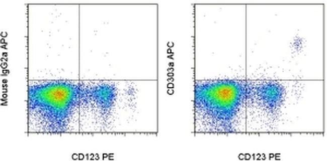 - Staining of normal human peripheral blood cells with Anti-Human CD123 PE (Product # 12-1239-42) and Mouse IgG2a K Isotype Control APC (Product # 17-4724-81) (left) or Anti-Human CD303a APC (right). Cells in the monocyte and lymphocyte gate were used for analysis.