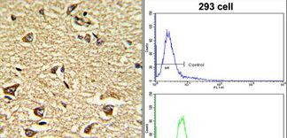 - (LEFT)Formalin-fixed and paraffin-embedded human brain tissue reacted with NUP155 Antibody , which was peroxidase-conjugated to the secondary antibody, followed by DAB staining. This data demonstrates the use of this antibody for immunohistochemistry; clinical relevance has not been evaluated. (RIGHT)Flow cytometric of 293 cells using NUP155 Antibody (bottom histogram) compared to a negative control cell (top histogram). FITC-conjugated goat-anti-rabbit secondary antibodies were used for the analysis.