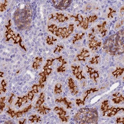 - Immunohistochemistry-Paraffin: CCBE1 Antibody [NBP1-83545] - Staining of human kidney shows strong luminal membranous positivity in renal tubules.