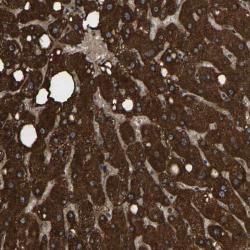 - Immunohistochemical staining of human liver shows strong cytoplasmic positivity in hepatocytes.