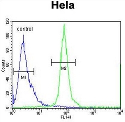 - Flow cytometric analysis of Hela cells?using ESCO2 Antibody ??(right histogram) compared to a negative control cell (left histogram). FITC-conjugated goat-anti-rabbit secondary antibodies were used for the analysis.