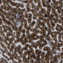 - Immunohistochemical staining of human liver shows distinct cytoplasmic positivity in hepatocytes.