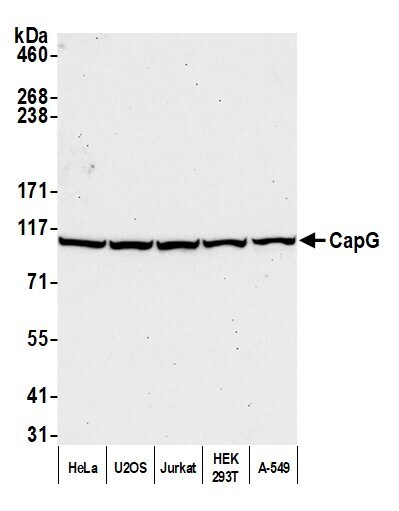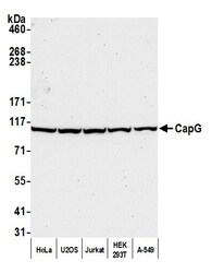 - Detection of human CapG by western blot. Samples: Whole cell lysate (50 µg) from HeLa, U2OS, Jurkat, HEK293T, and A-549 cells prepared using NETN lysis buffer. Antibody: Affinity purified rabbit anti-CapG antibody (Product # A300-602A lot 2) used for WB at 0.1 µg/mL. Detection: Chemiluminescence with an exposure time of 30 seconds.