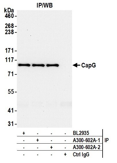 - Detection of human CapG by western blot of immunoprecipitates. Samples: Whole cell lysate (1.0 mg per IP reaction; 20% of IP loaded) from HeLa cells prepared using NETN lysis buffer. Antibodies: Affinity purified rabbit anti-CapG antibody (Product # A300-602A; Lot 2) used for IP at 6 µg per reaction. CapG was also immunoprecipitated by a previous lot of this antibody (Product # A300-602A; Lot 1) and a second antibody against a different epitope of CapG (BL2935). For blotting immunoprecipitated CapG, Product # A300-602A was used at 0.2 µg/mL. Detection: Chemiluminescence with an exposure time of 10 seconds.