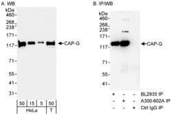 - Detection of human CAP-G by western blot and immunoprecipitation. Samples: Whole cell lysate from HeLa (5, 15 and 50 µg for WB; 1 mg for IP, 20% of IP loaded) and 293T (50 µg for WB) cells. Antibodies: Affinity purified rabbit anti-CAP-G antibody A300-602A used for WB at 0.04 µg/ml (A) and 1 µg/ml (B) and for IP at 3 µg/mg lysate (B). CAP-G was also immunoprecipitated using rabbit anti-CAP-G antibody BL2935, which binds an upstream epitope. Detection: Chemiluminescence with exposure times of 30 seconds (A and B).