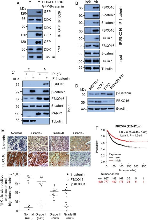 - Figure 1 FBXO16 interacts with beta-catenin. (A) MCF7 cells coexpressing DDK-FBXO16, either with vector control or GFP-beta-catenin for 40 h, were then incubated with 5 mu m MG132 for 6 h. Whole-cell lysates were immunoprecipitated with the indicated antibodies. Immunoprecipitates and input lysates were separated on SDS-PAGE and immunoblotted for the indicated proteins. Tubulin was used as a loading control throughout our study ( n = 3). (B) Whole-cell lysates of MCF7 cells, pretreated with 5 mu m MG132 for 6 h before harvesting, were immunoprecipitated with the indicated antibodies to pull-down endogenous proteins. IgG immunoprecipitates were used as a control. Immunoprecipitates and input lysates were separated on SDS-PAGE and immunoblotted for the indicated proteins ( n = 2). (C) Nuclear and cytoplasmic fractions were immunoprecipitated with either anti-beta-catenin antibody or IgG. Immunoprecipitates and input lysates were separated on SDS-PAGE and immunoblotted for the indicated proteins ( n = 2). Cells were grown in the presence of 5 mu m MG132 for 6 h before harvesting. (D) Whole-cell protein extracts of MCF10A, MCF7, T47D, and MDA-MB-231 cells were immunoblotted for beta-catenin, FBXO16, and tubulin ( n = 3). beta-actin was used as a loading control. (E) (Top) Expression levels of beta-catenin (top row) and FBXO16 (bottom) in samples of normal and different grades of breast cancer. Tissues were immunostained as described in the 'Materials and methods' section. Lower