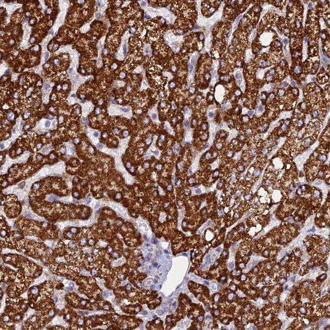 - Immunohistochemical staining of CLCN7 in human liver tissue shows strong cytoplasmic positivity in hepatocytes. Samples were probed using a CLCN7 Polyclonal Antibody (Product # PA5-60203).