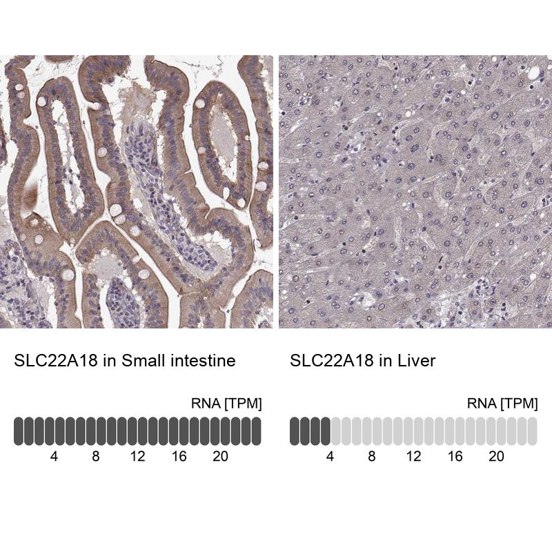 - Immunohistochemistry analysis in human small intestine and liver tissues using Anti-SLC22A18 antibody. Corresponding SLC22A18 RNA-seq data are presented for the same tissues.