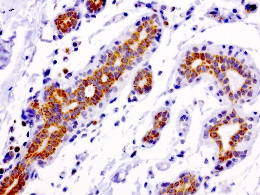 - Immunohistochemical staining of paraffin-embedded human breast normal adjacent using anti-MRPS34 clone UMAB125 mouse monoclonal antibody at 1:200 dilution 1mg/mL and detection with Polink2 Broad HRP DAB. UM500090 requires heat-induced epitope retrieval with citrate pH6.0 in a presure cooker for 3 minutes at 110°C. The image shows membranous and cytoplasmic staining in breast epithelia cells.