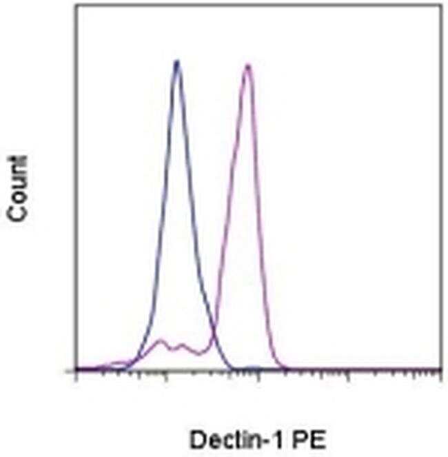 - Staining of normal human peripheral blood cells with Mouse IgG2a K Isotype Control PE (Product # 12-4724-81) (blue histogram) or Anti-Human/Non-Human Primate CD369 (Clec7a, Dectin-1) PE (purple histogram). Cells in the monocyte gate were used for analysis.