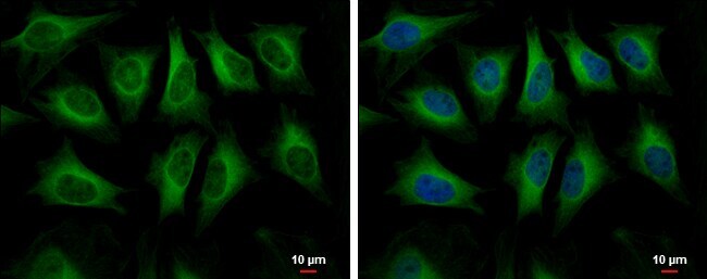 - Immunocytochemistry-Immunofluorescence analysis of HMGCS1 was performed in HeLa cells fixed in 4% paraformaldehyde at RT for 15 min. Green: HMGCS1 Polyclonal Antibody (Product # PA5-29488) diluted at 1:500. Blue: Hoechst 33342 staining. Scale bar = 10 µm.