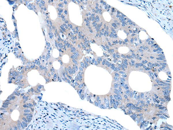 - Immunohistochemical analysis of UNC5B in paraffin-embedded Human colorectal cancer tissue using (left) UNC5B Polyclonal Antibody (Product # PA5-67631) at a 1:25 dilution and (right) is treated with synthetic peptide. (Original magnification: x200).