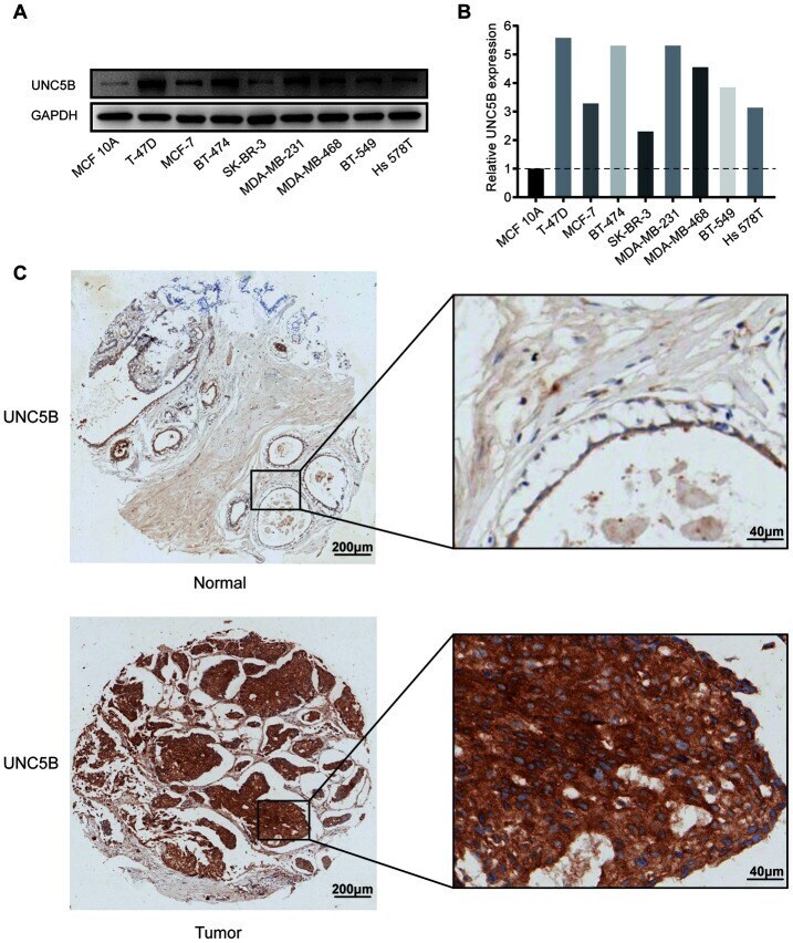 - Figure 3 UNC5B protein expression in breast cancer (Western blot and IHC). ( A ) UNC5B expression in MCF 10A cells and diverse breast cancer cell lines. ( B ) The relative UNC5B protein expression in MCF 10A cells and diverse breast cancer cell lines. ( C ) Representative IHC image of UNC5B expression in breast cancer tissues and normal breast tissues.
