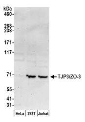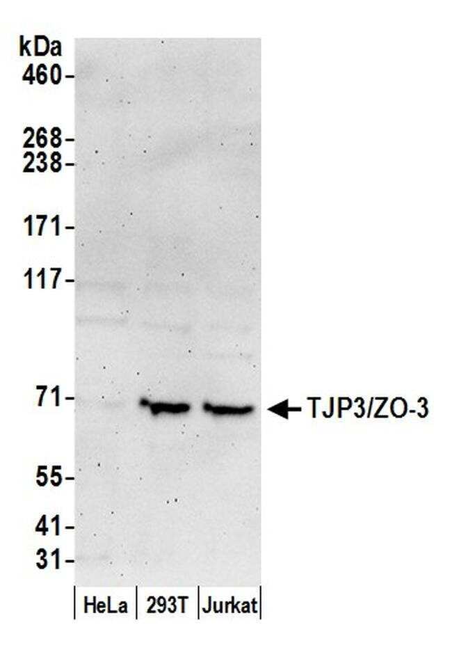 - Detection of human TJP3/ZO-3 by western blot. Samples: Whole cell lysate (50 µg) from HeLa, 293T, and Jurkat cells prepared using NETN lysis buffer. Antibody: Affinity purified rabbit anti-TJP3/ZO-3 antibody A304-926A-M (lot A304-926A-M-1) used for WB at 1:1000. Detection: Chemiluminescence with an exposure time of 3 minutes.